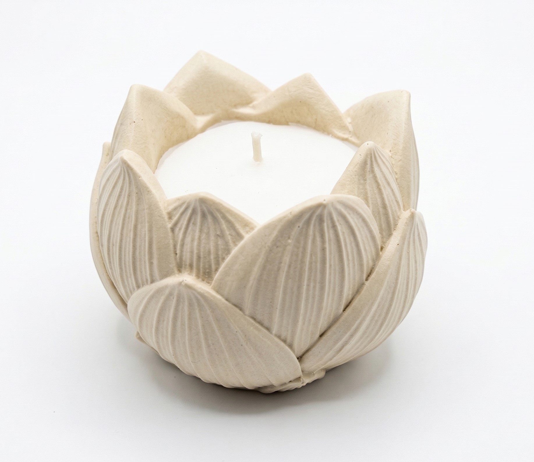 Drugie życie produktu: Kształt lotosu jest na tyle uniwersalny, że po wypaleniu wosku naczynie idealnie sprawdzi się jako świecznik na podgrzewacz typu tealight lub ozdobna miseczka na drobną biżuterię.